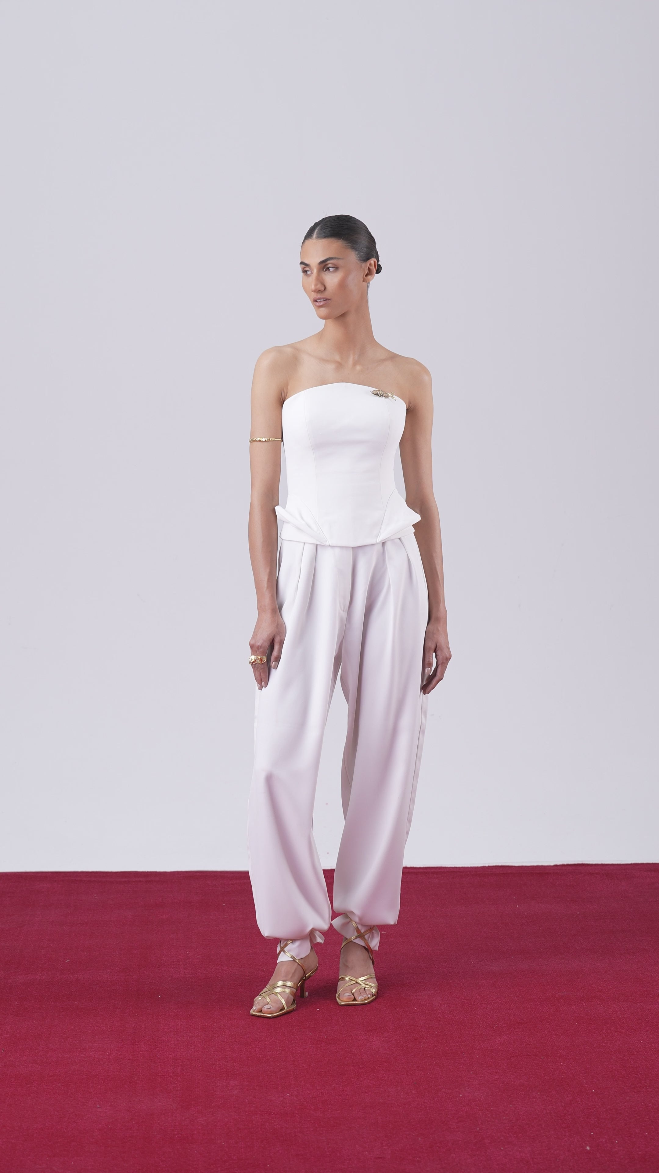 I kept them as one because they complete each other. The bustier steadies me, the trousers carry me forward. One holds my silence, the other moves my story. Worn together, they remind me that presence doesn’t need to be loud to be lasting.